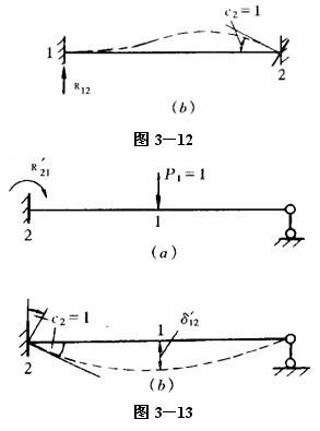 上式表示同一線性彈性體系由單位位移cl=1所引起的與位移c2相應的反力R21等于由單位位移c2=1所引起的與位移cl相應的反力R12。如圖3—12a、b中的R12=R21。