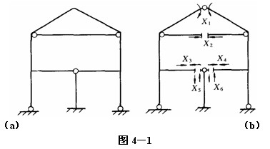 去除圖4—1a所示超靜定結構的多余約束的方法之一如圖4—1b所示,去除六個多余約束后,就成為靜定結構,故為超靜定六次。再用其他去除多余約束的方案確定其超靜定次數,結果是相同的。