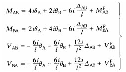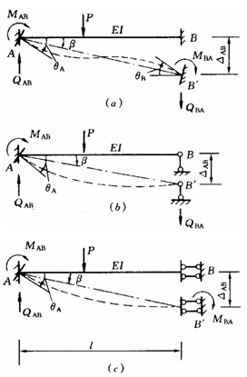 式中 i = EI/l稱為線剛度。桿端截面轉角θA、θB、弦轉角β = ΔAB/l,桿端彎矩MAB、MBA,固端彎矩MABF、MBAF均以順時針向轉動為正。桿端剪力QAB、QBA,固端剪力QABF、QBAF均以繞隔離體順時針向轉動為正。圖4—6所示桿端位移、桿端彎矩、桿端剪力的方向均為正號。