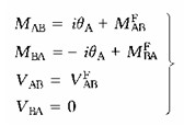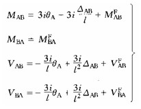 式(4—9)、(4—10)中各符號的意義及正、負號規定均與式(4—8)相同。式(4—8)、(4—9)、(4—10)稱為前述各相應桿件的轉角位移方程,式中含有θA、θB、ΔAB的各項分別代表該項桿端位移引起的桿端彎矩和桿端剪力,其前面的系數稱為桿件的剛度系數,它們只與桿件的長度l、支座形式和抗彎剛度EI有關,又稱為形常數。而固端彎矩、固端剪力則為僅由荷載產生的桿端彎矩、桿端剪力,它們均與荷載有關,幾種常見荷載產生的固端彎矩和固端剪力見表4—1。