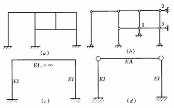圖4—7c所示剛架,其橫梁不能彎曲,當不考慮各桿軸向變形時,兩個剛結點不能轉動,只有一個獨立的結點線位移未知量。圖4—7d所示結構,如果考慮柱頂軸力桿的軸向變形,而不計受彎桿柱子的軸向變形,則有兩個獨立的結點線位移未知量。