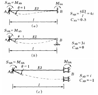 轉(zhuǎn)動剛度SAB表示AB桿的A端抵抗轉(zhuǎn)動的能力,其值等于A端轉(zhuǎn)動單位轉(zhuǎn)角時A端所需施加的力矩,力矩值的大小與B端的約束情況及桿件的彎曲剛度有關(guān)。圖4—10a、b、c所示三種等截面直桿的轉(zhuǎn)動剛度示于圖中。