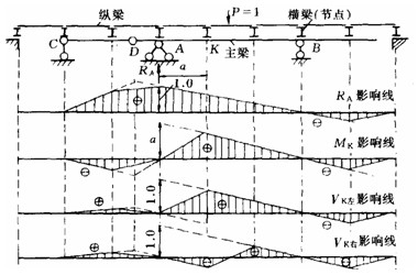 圖5—3所示結(jié)構(gòu),荷載通過縱梁、橫梁(節(jié)點(diǎn))傳至主梁,主梁承受的是節(jié)點(diǎn)(間接)荷載。當(dāng)P=1在相鄰兩個(gè)橫梁間移動(dòng)時(shí),主梁某量值按直線變化;而當(dāng)P=1作用在節(jié)點(diǎn)上時(shí),相當(dāng)于直接作用在主梁上,所以這種主梁某量值的影響線可按下法求作: