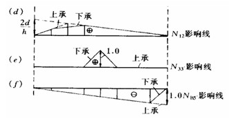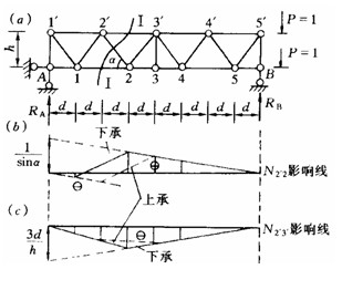 (3)先用結(jié)點法和截面法建立桁架桿件內(nèi)力的影響線方程,再根據(jù)方程作出影響線。