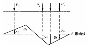 圖5—5表示一組位置、數(shù)值都已知的集中荷載及某量值S影響線。根據(jù)影響線的概念及疊加原理,該集中荷載組產(chǎn)生的量值S為