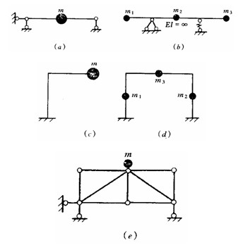 實際結構的質量都是連續分布的,均為無限自由度體系。有時為了簡化計算,將連續 分布的質量用集中質量來代替,例如圖6—1a、b、c、d所示體系,如果不計桿件軸向變形和集中質量的轉動慣性,則其動力自由度分別為1、1、2、4。而圖6—1e所示桁架的動力自由度為2,這是由于桁架桿件應考慮軸向變形。