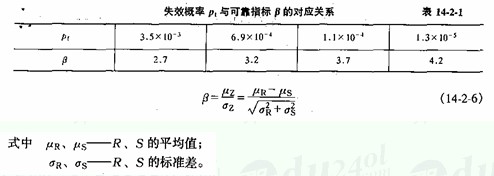 用失效概率度量結構構件的可靠度,概念合理,意義明確,但在計算上較繁,可以用與失效概率有相應關系的可靠指標β來度量,見表 14-2-1 。