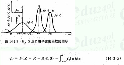 結構構件的可靠指標應該很據基本變量的平均值、標準差及其概率分布類型進行計算。如果功能函數中的基本變量 R 、 S 均為正態分布,而且極限狀態是線性的,則R、 S、 Z的概率密度函數圖形示如圖 14-2-2 , 則圖中縱坐標左面以pf 表示的面積即為失效概率pf ,即
