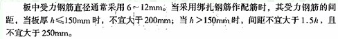 分布鋼筋按構(gòu)造配置,常用直徑為 6mm 和 smm 。分布鋼筋的截面面積不應(yīng)小于受力鋼筋截面面積的15%,其間距不宜大于 250mm。