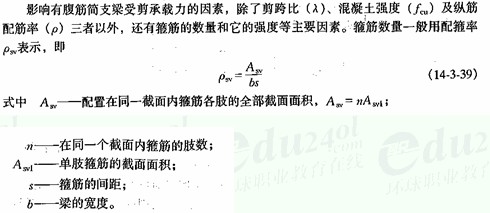 當腹筋的配置數量過少且剪跨比較大(λ> 3 )時,斜裂縫一旦出現,腹筋承受不了原來由混凝土所承擔的拉力,腹筋立即到達屈服,它不能抑制斜裂縫開展,梁發生斜拉破壞。