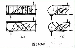 由于影響混凝土受彎構件受剪破壞的因素很多,受剪破壞形態復雜,及劉餛凝土構件受剪機理的認識尚不足,國內外規范所采用的計算模式不盡相同。圖14-3-9 ( b )所示的拱形桁架模型只是其中的一種:基本拱體I是拱形衍架的上弦壓桿,拱桿 II 、III 是受壓腹桿,縱向鋼筋是下弦拉桿,箍筋或彎筋是受拉腹桿