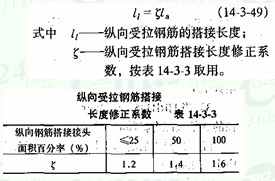 縱向受拉鋼筋綁扎搭接接頭的搭接長度應根據位于同一連接區段(連接區段的長度為 1.3 倍搭接長度)內的鋼筋搭接接頭面積百分率(是指在同一連接范圍內,有搭接接頭的受力鋼筋與全部受力鋼筋截面面積的百分比值)按下式計算: