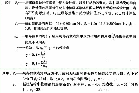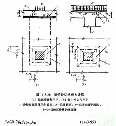 1 在局部荷載或集中反力作用下不配置箍筋或彎起鋼筋的鋼筋餛凝土板.其受沖切承載力可按下式計算 ( 圖 14-3-26 )