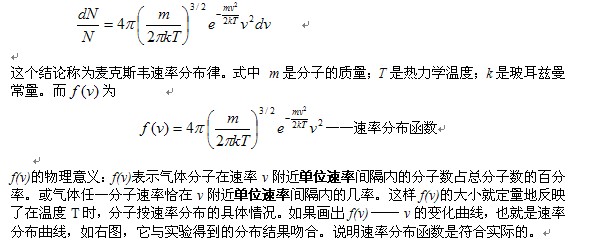 1859年,麥克斯韋運用統計理論導出氣體分子按速率分布的規律:當氣體處于平衡態時,分布在任一速率間隔v→v+dv內的分子數占總分子數的比率為