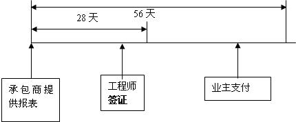 (4)業(yè)主支付。承包商的報表經(jīng)過工程師認可并簽發(fā)工程進度款的支付證書后,業(yè)主應在接到證書后及時給承包商付款。業(yè)主的付款時間不應超過工程師收到承包商的月進度付款申請單后的56天。如果逾期支付將承擔延期付款的違約責任,延期付款的利息按銀行貸款利率加3%計算。