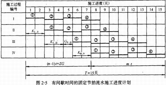 對于有間歇時間的固定節拍流水施工,其流水施工工期T可按下式計算:
