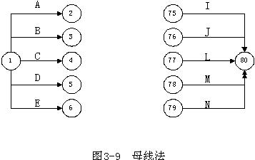 但當網絡圖的起點節點有多條箭線引出(外向箭線)或終點節點有多條箭線引入(內向箭線)時,為使圖形簡潔,可用母線法繪圖。