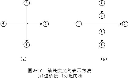 (7)應盡量避免網絡圖中工作箭線的交叉。當交叉不可避免時,可以采用過橋法或指向法處理,如圖3—10所示。