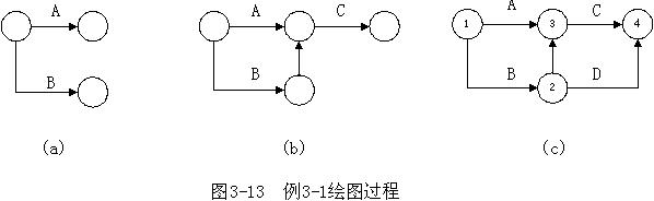 2.按前述原則(2)中的情況①繪制工作箭線C,如圖3—13(b)所示。