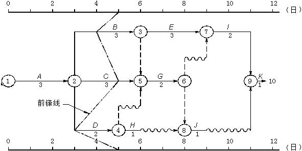 工程項目實際進度前鋒線是在時標網絡計劃圖上標示,為清楚起見,可在時標網絡計劃圖的上方和下方各設一時間坐標。