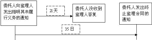 (4)如果委托人認為監理人無正當理由而又未履行監理義務時,可向監理人發出指明其未履行義務的通知。若委托人在21天內沒收到答復,可在第1個通知發出后35日內發出終止監理合同的通知,合同即行終止。