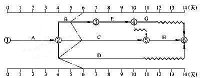 5.某分部工程雙代號時標網絡計劃執行到第6天結束時,檢查其實際進度如下圖前鋒線所示,檢查結果表明( )。