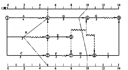 3.某工程雙代號時標網絡計劃及第5周末、第10周末檢查實際進度時前鋒線如下圖所示,檢查結果表明( )。