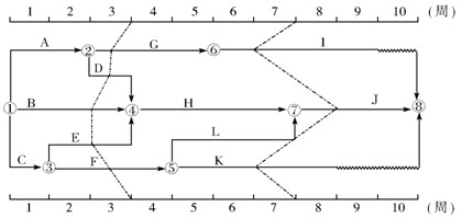 7.某工程雙代號(hào)時(shí)標(biāo)網(wǎng)絡(luò)計(jì)劃執(zhí)行到第3周末和第7周末時(shí),檢查其實(shí)際進(jìn)度如下圖前鋒線所示,檢查結(jié)果表明( AC )。