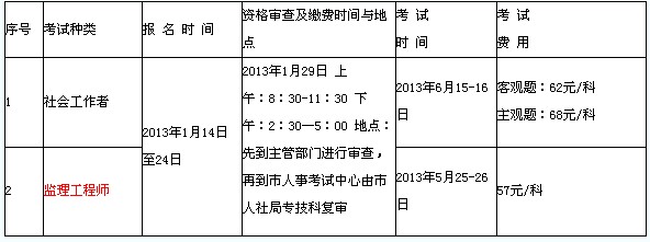 根據省人力資源和社會保障廳皖人社秘〔2013〕6號、皖人社秘〔2013〕7號文件通知精神,現將我市2013年度社會工作者、監理工程師等2類考試報名及考務工作有關問題通知如下: