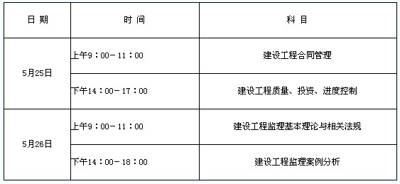 2013年度監(jiān)理工程師執(zhí)業(yè)資格考試定于5月25日至26日舉行,考試科目和具體時間為: