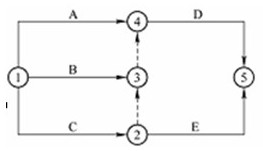 ( D )43、某雙代號(hào)網(wǎng)絡(luò)圖有A、B、C、D、E五項(xiàng)工作,如下圖所示,下列有關(guān)工作邏輯關(guān)系的選項(xiàng)中,正確的是 。