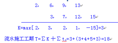 解析:流水步距等于流水節(jié)拍[6,6,4]的最大公約數(shù),即:K= 2工作隊(duì)數(shù)為 n’= 6/2+6/2+4/2 = 3+3+2 =8工期為 T=(m+ n’-1)K=(4+8-1)×2=22天。