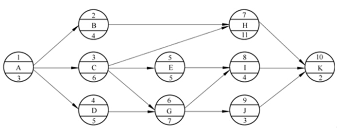 解析:1)通過(guò)計(jì)算時(shí)間間隔來(lái)判定關(guān)鍵線路,時(shí)間間隔為零的線路即為關(guān)鍵線路;2)通過(guò)直接觀察法判定,計(jì)算各條線路工作持續(xù)時(shí)間之和選最大者。如:A-B-H-K: 3+4+11+2=20; A-C-H-K: 3+6+11+2=22; A-C-E-I-K: 3+6+5+4+2=20; A-C-G-I-K: 3+6+7+4+2=22; A-C-G-J-K: 3+6+7+3+2=21; A-D-G-I-K: 3+5+7+4+2=21; A-D-G-J-K: 3+5+7+3+2=20