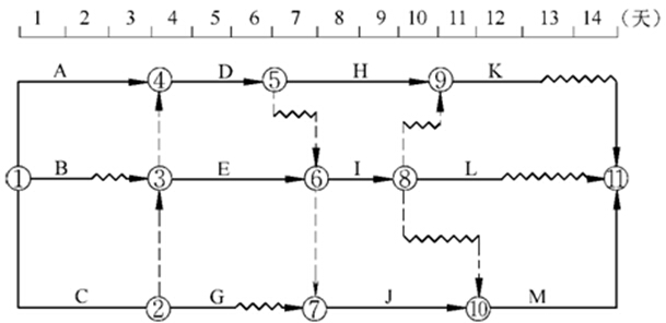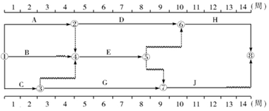 解析:圖中C的總時差為2周(J和G各有2周總時差),可令其晚開工2周,最遲完成時間為第4周,與E最早開始時間相同,E的最早完成時間第8周末與關鍵工作H開始時間第10周末相差2周,施工機械閑置共計2周。