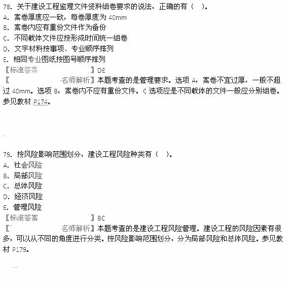 【老師解析】本題考查的是建設工程監理主要文件資料分類及編制要求。建設工程監理主要文件資料包括:(1)勘察設計文件、建設工程監理合同及其他合同文件;(2)監理規劃、監理實施細則;(3)設計交底和圖紙會審會議紀要;(4)施工組織設計、(專項)施工方案、施工進度計劃報審文件資料;(5)分包單位資格報審會議紀要;(6)施工控制測量成果報驗文件資料;(7)總監理工程師任命書,工程開工令、暫停令、復工令,開工或復工報審文件資料;(8)工程材料,構配件,設備報驗文件資料;(9)見證取樣和平行檢驗文件資料;(10)工程質量檢驗報驗資料及工程有關驗收資料;(11)工程變更、費用索賠及工程延期文件資料;(12)工程計量、工程款支付文件資料;(13)監理通知單、工程聯系單與監理報告;(14)第一次工地會議,監理例會、專題會議等會議紀要;(15)監理月報、監理日志、旁站記錄;(16)工程質量或安全生產事故處理文件資料;(17)工程質量評估報告及竣工驗收監理文件資料;(18)監理工作總結。參見教材P168。