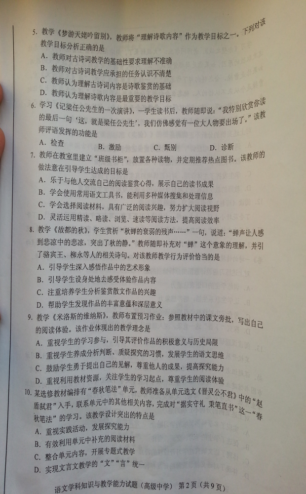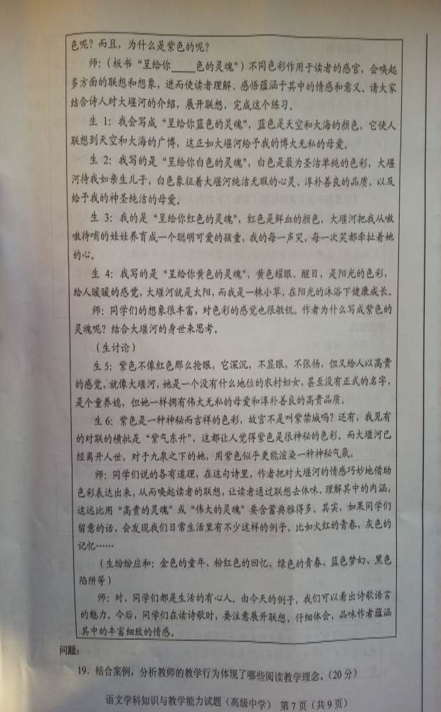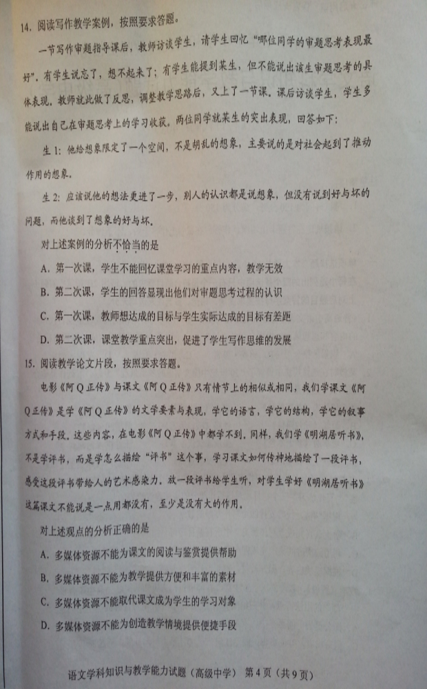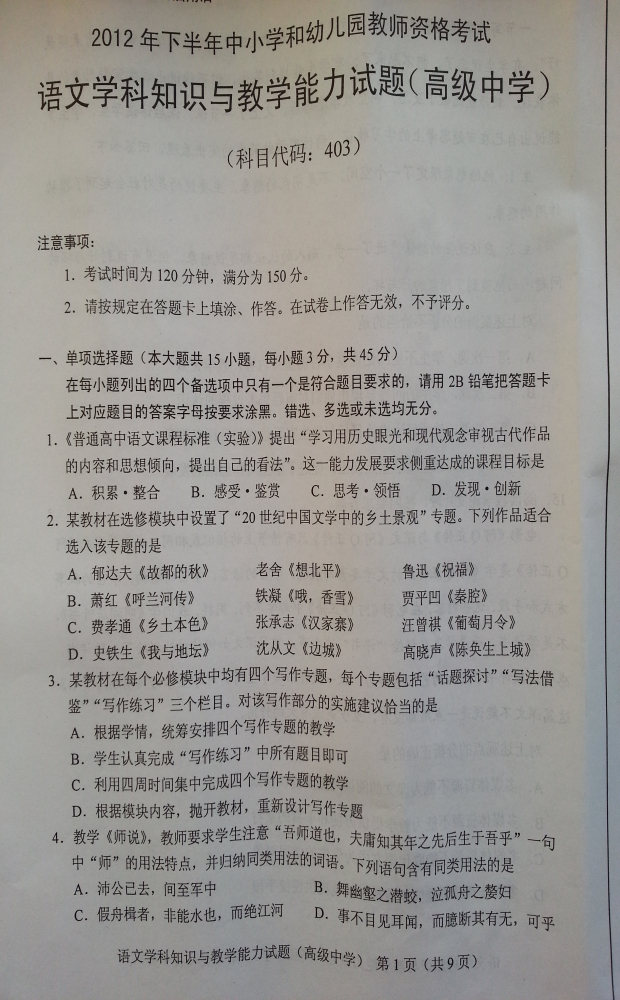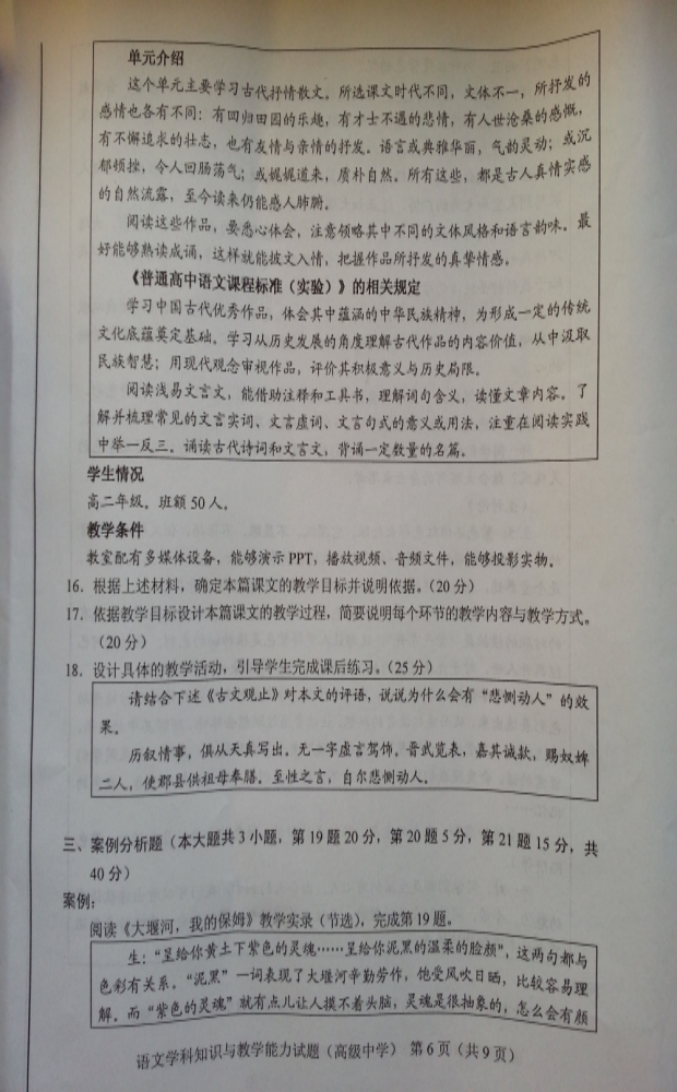 2012下半年教師資格考試《語文科學知識與教學能力》真題(高級中學)