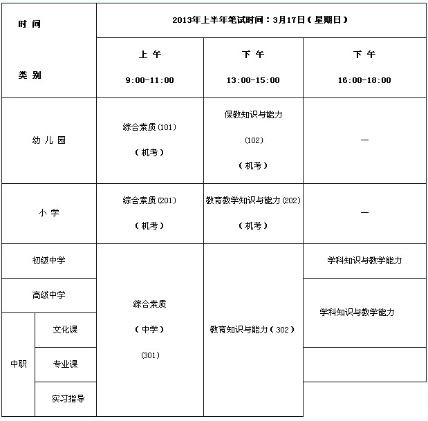 2013年上半年筆試考試時間為3月17日,筆試各科考試時間均為120分鐘。