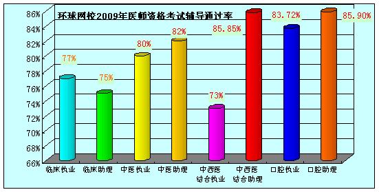網校09年執(zhí)業(yè)醫(yī)師考試各科目輔導通過率分別為:臨床執(zhí)業(yè)醫(yī)師77%,臨床執(zhí)業(yè)助理醫(yī)師75%,中醫(yī)執(zhí)業(yè)醫(yī)師80%,中醫(yī)助理醫(yī)師82%,中西醫(yī)結合執(zhí)業(yè)醫(yī)師73%,中西醫(yī)結合助理醫(yī)師85.85%,口腔執(zhí)業(yè)醫(yī)師83.72%,口腔執(zhí)業(yè)助理醫(yī)師85.90%,詳細見下圖:
