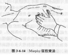 膽騰腫大情況隨疾病性質而有所不同。有時膽騰有炎癥,而并無腫大或未腫大到肋緣以下,觸診不能查到膽騰.此時可探測膽騰觸痛(Murphy征)。檢查時醫師以左手掌平放放于患者右胸下部,以拇指指腹鉤壓于右肋下膽騰點處(圖3-6-14),然后囑患者緩慢深吸氣。在吸氣過程中發炎的膽囊下移時撞及用力按壓的拇指,即可引起疼痛,此為膽囊觸痛,如深吸氣時患者感覺疼痛并中止吸氣稱M urphy 征陽性。在膽總管結石膽道阻塞時。可發生明顯黃疸,但膽囊常不腫大,乃因慢性炎癥,囊壁纖維化而皺縮,且與周圍組織粘連而失去移動性。由于胰頭癌壓迫膽總管所致的膽道阻塞、黃疸進行性加深,膽囊也顯著腫大,但無壓痛,稱為Courvoisier征陽性。