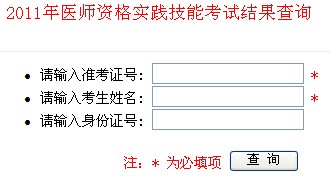 2011年石家莊市醫師實踐技能考試成績查詢入口開通,輸入準考證號、姓名、身份證號即可查詢。