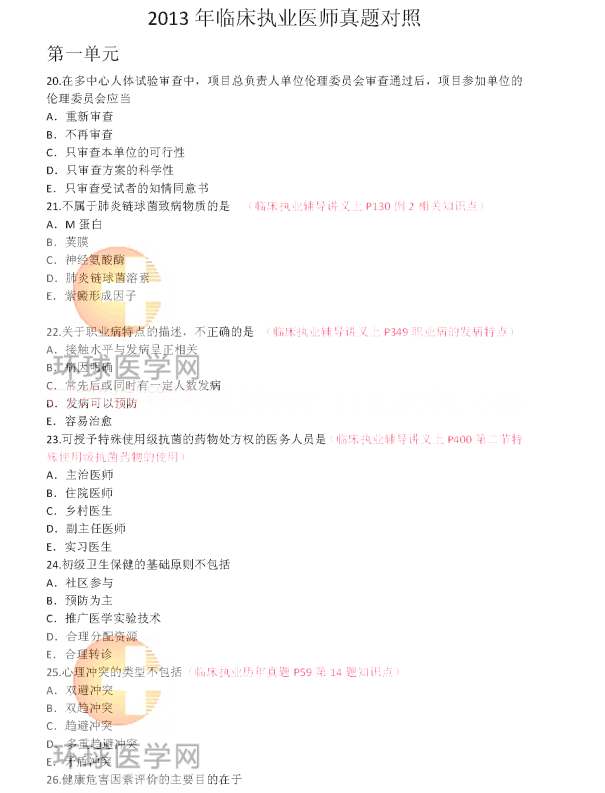 摘要 2013年臨床執業醫師考試第一單元真題對照