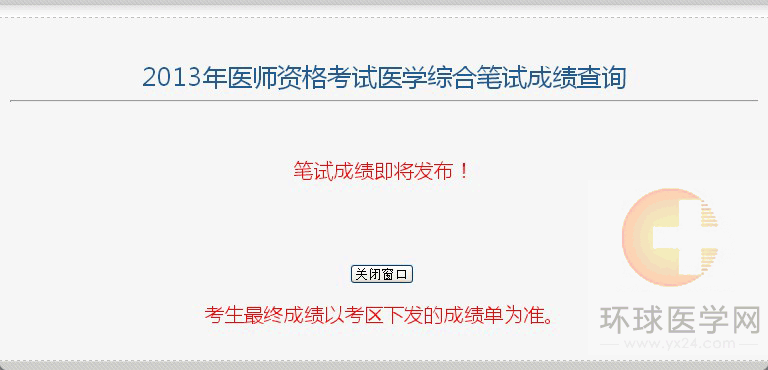 摘要 2013年醫師資格考試醫學綜合筆試成績查詢即將開始,環球網校醫學網會第一時間公布查詢時間,敬請廣大考生隨時關注我網站的考試動態。