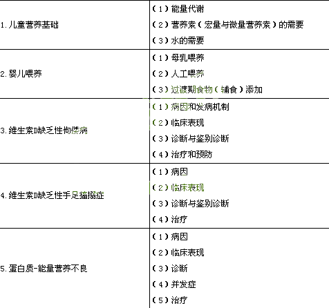 | (二)生長(zhǎng)發(fā)育 | (1)小兒生長(zhǎng)發(fā)育的規(guī)律 (2)體格生長(zhǎng)常用指標(biāo) (3)骨骼發(fā)育和牙齒發(fā)育 (4)運(yùn)動(dòng)和語(yǔ)言發(fā)育 | |