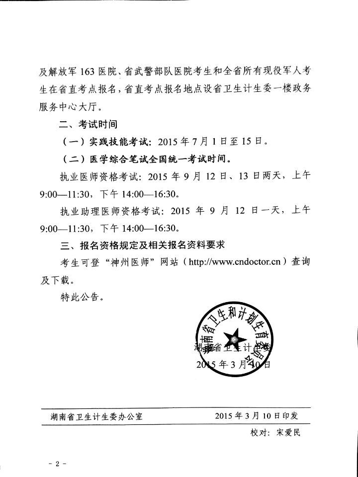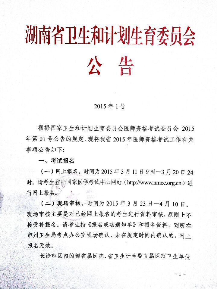 湖南省衛生和計劃生育委員會發布2015年醫師資格考試公告,環球網校醫學考試網整理并提醒考生安排好報名時間,及早報名。