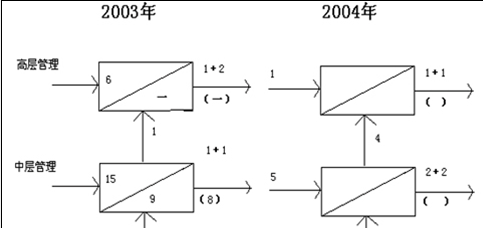 2、某公司2003―2004年度管理人員變動(dòng)情況如圖1所示,2004年度各級(jí)管理人員的補(bǔ)充是通過外部招聘的方式來完成的,公司高層在總結(jié)本年度人力資源管理工作經(jīng)驗(yàn)的基礎(chǔ)上,做出了以下人策:首先,2005年度除一般管理人員可以通過外部各種招聘渠道補(bǔ)充之外,其他各層次管理人員一律由公司內(nèi)部選拔;其次,各個(gè)層次的管理人員補(bǔ)充需要量嚴(yán)格按照公司制定的定員標(biāo)準(zhǔn)執(zhí)行,不得突破額定人數(shù);最后,要妥善安排好提升受阻的后備人才。2005年管理崗位人員接替統(tǒng)計(jì)表見表1。