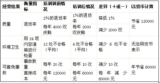 2.亞飛皮鞋廠在生產經營中曾出現三個問題。第一,每年生產的皮鞋有2%由于質量太差而被退貨;第二,車間生產作業環境不好,如車問地上的釘子可能會傷到員工;第三,可避免的事故發生率高于行業平均水平。為解決這些問題,廠部對管理人員進行了如下培訓:(1)開展與質量問題、員工不良習慣有關的績效管理和人際關系技能培訓;(2)如何表彰績效有提高的員工。一線主管人員、輪班監督人員和經理層共40人參加了由公司培訓教師主講的為期2周的培訓課程。培訓在工廠附近的一家酒店內進行。培訓項目是從一家咨詢機構引進的,其中包括了錄像資料和專用教材。而且.該項目的指導者是一名培訓老師。有關資料如表1和表2所示。