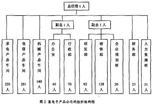 圖2為某電子產品公司的組織結構圖.該圖表明,總經理對公司的財務和人事工作全權負責,并直接管理家電產品車間、電信產品車間及機械產品車間3個生產部門.設副總經理2名,其中1名負責企業的行政部和辦公室的工作:另1名副總經理負責研發部、銷售部以及企業規劃部的運作.公司的業務流程是,由企業規劃部在總經理和1名主管副總的領導下,根據市場信息來規劃產品的研制與生產;研發部門按照企業規劃部的規劃,負責新產品的研發工作;新產品研制成功,經公司領導討論決定后,交由產品車間負責生產;銷售部銷售生產出來的產品,并負責收集市場反饋信息.