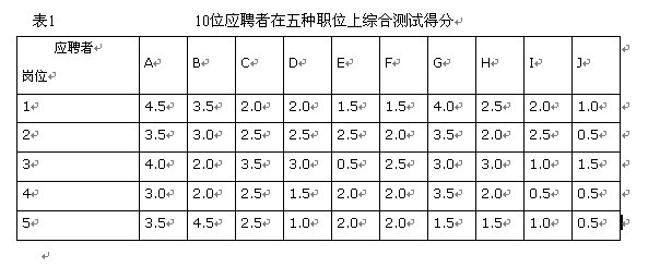 某企業根據生產經營需要,決定招聘1、2、3、4、5五種職位所需要的人員,如果假設崗位1、崗位2、崗位3、崗位4、崗位5所需的最低測試分數分別3.5,2.5,2.5,3.0,3.5,要從這10個人中選出5人來擔當不同的崗位,其綜合測試得分如表1: