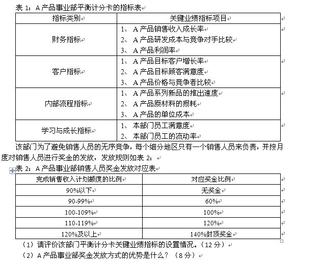 4、Y公司為其新開發(fā)的A產品專門成立了A產品事業(yè)部,負責A產品的研發(fā)和銷售工作。A產品是一種全新概念的產品,市場發(fā)展前景良好,市場上暫時沒有類似的產品能與其相比。公司對該部門的要求是,盡一切可能占領市場,加大對研發(fā)的投入,保持技術的領先性,樹立品牌的形象,最近兩年對利潤率的要求不高。Y公司為該部門設計了今年部門的平衡計分卡,設計的結果如表1: