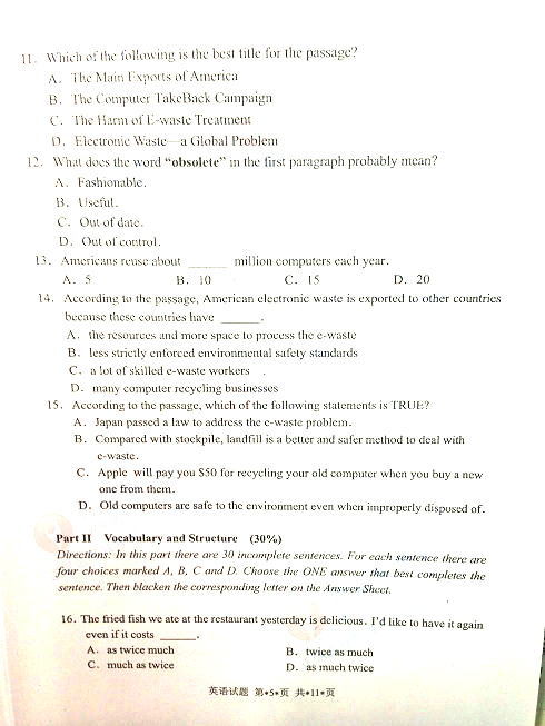 - 2021年4月廣東學位英語考試真題(A卷網友版)2021-05-18